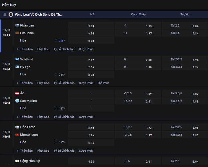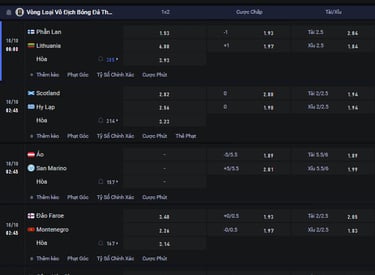 Khám phá bảng tỷ lệ kèo châu Âu, châu Á và Tài/Xỉu mới nhất cho các trận đấu hấp dẫn trong khuôn khổ Vòng Loại Vô Địch Bóng Đá Thế Giới.